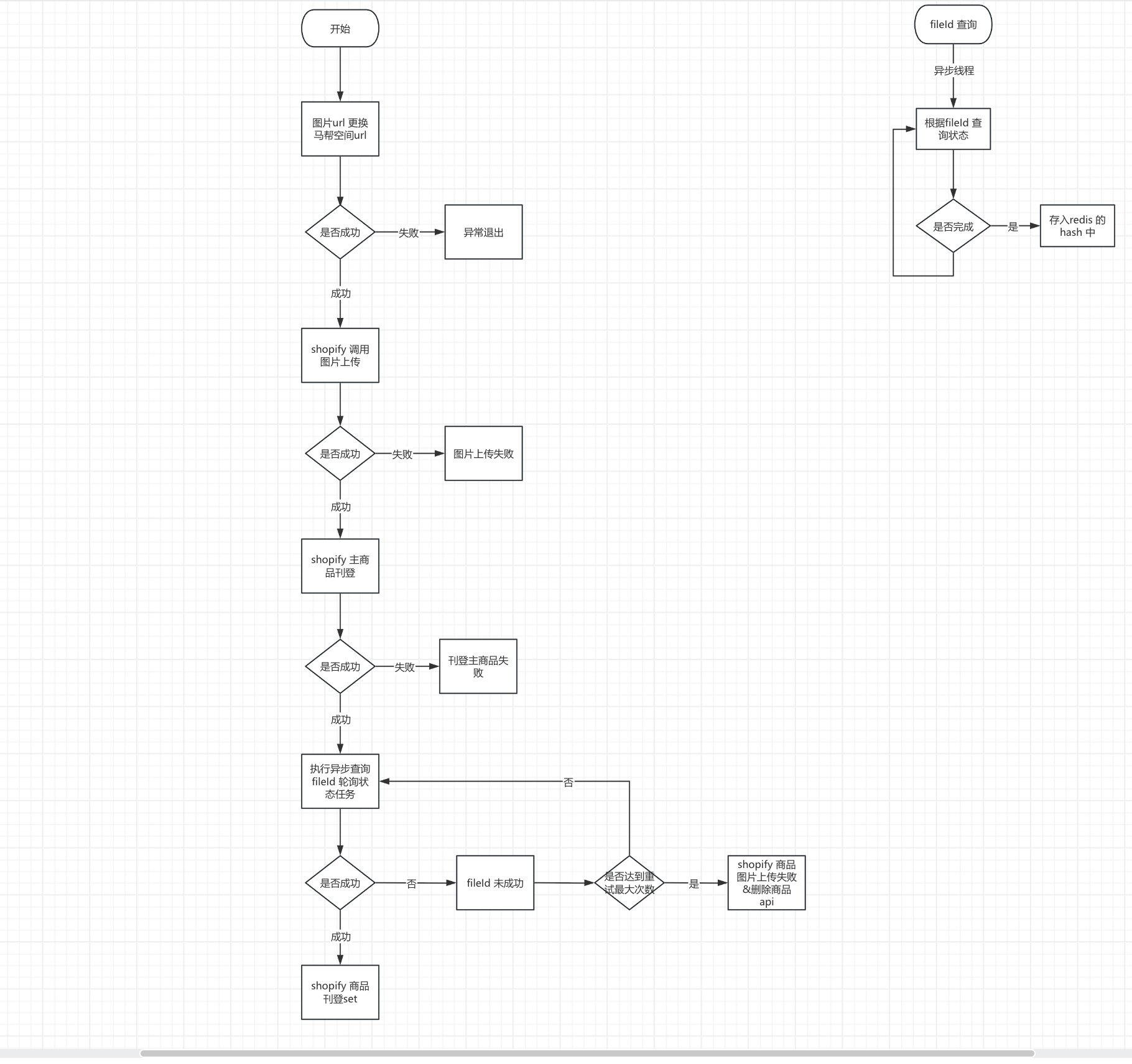 ## 背景 ##### shopify 图片文件上传因为历史原因,导致在调用附加图片api时发生图片id 状态未就绪,导致整个刊登结果失败。 ## 方案 ##### 针对上述背景问题,目前会在整体流程上面添加图片id 是否就绪查询check 环节,使用异步线程completableFuture来获取图片集最终结果,当所有图片id 全部都是ready 状态,执行附加图片api 调用,否则提前终止刊登结果。 ## 业务时序图  ## 新增shopify 查询图片fileId 状态 ##### 接口地址 : https://shopify.dev/docs/api/admin-graphql/latest/queries/files