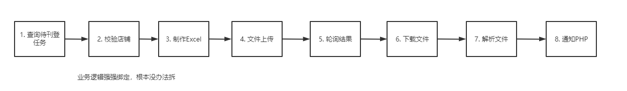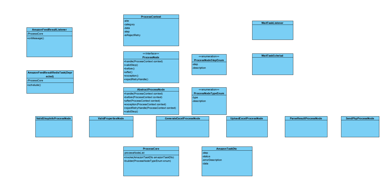 ## 一. 开篇    开篇之前说点题外话。Java做为一门面向对象编程的语言,是十分注重编码规范和架构设计的。但是在很多情况下,很多公司或很多项目团队是为了封装而封装,抽象而抽象反而得不偿失。因此在**合适的场景使用合适的封装才是最好的做法**!!!切记!!! **源码地址:** http://git.mabangerp.com:2280/m-lis/mdc-product-amazon.git ## 二. 业务背景    亚马逊平台作为公司主力平台之一,一直都投入了大量的精力和人员去做维护。但是每一次有新的业务需求研发都会经过从0到1的过程。而且还需要去解决各自数据中间态的问题。因此现在我们主要是针对我司两种刊登方式: 专业版Excel模板刊登, ERP平台商品刊登进行讨论。    在刊登的业务链路里面,我们需要针对于亚马逊平台调用很多接口,而且接口与接口之间存在着强依赖。同时模板刊登和商品刊登两种方式也存在着**业务交叉**。因此为了更好地去管理这两种方式并且也更好的去维护编码,决定采用**责任链**设计模式来做为本次2.0新架构的托底架构设计(PS: JSON刊登不算在此列。因为还在研究中) ## 三. 旧设计 ### 1. 逻辑图  ### 2. 弊端    业务逻辑强强绑定,根本没办法拆。比如ERP商品刊登写了这些逻辑以后,后面增加了一个专业版刊登场景,两个场景调用平台接口是一致的。但是因为代码耦合度太高,导致调用平台接口这一块的逻辑没办法拆分出来,也就导致了代码不可复用。而且中间态数据也乱飞,消耗了平台接口令牌也因为后续系统原因会重复调用消耗,重复执行幂等性代码等一系列弊端 ## 四. 新2.0设计 ### 1. 设计思路    根据上述旧架构设计的弊端,新架构就是为了解决这系列问题。**解决思路就是我们按照面向对象的思维,把上述架构图业务逻辑拆分成一个一个的动作,把每一个动作都看作成节点**。然后所有节点可以看作是一条大的链表。这样从编码角度和业务角度把耦合度拆分。同时节点与节点之间的沟通都通过一个上下文类来作为沟通的桥梁,方便下行节点拿到上行节点的中间态数据,同时如果出了异常那么就可以通过上下文把中间态数据存入DB,最后上下文还充当数据管家作用 ### 2. UML类图设计  ### 3. 优点 1. 业务耦合度底 2. 随意增删节点,不会影响其它节点业务 3. 能较好处理中间态数据 4. 能更好的处理流程,不走重复业务 ### 4. 缺点 1. 事务(如果链路很长,开启了的事务就需要等很久。这会造成锁持有时间过长。解决方式是每个节点都处理各自业务数据,并且在抽象模板层面上做好异常回滚的自有逻辑编写) 2. 请求的传递,在DEBUG的时候比较麻烦 3. 代码编写要求更高,并且要做业务与中间态数据承上启下 ## 五. 未来畅想(3.0设计) 1. 有后台系统维护页面,能够在页面上增加链路配置 2. 现阶段针对于每一个步骤数据节点搜集太少,并且强依赖腾讯云日志,后续可以在ES或其它NoSQL里面做生命周期快照。主要是在系统中看数据流向,数据明细等 网上找到如图所示:   ## 六. 尾声    如有新想法,请及时联系方罗(Tel:13258230237 Email:fangluo@mabangerp.com)
